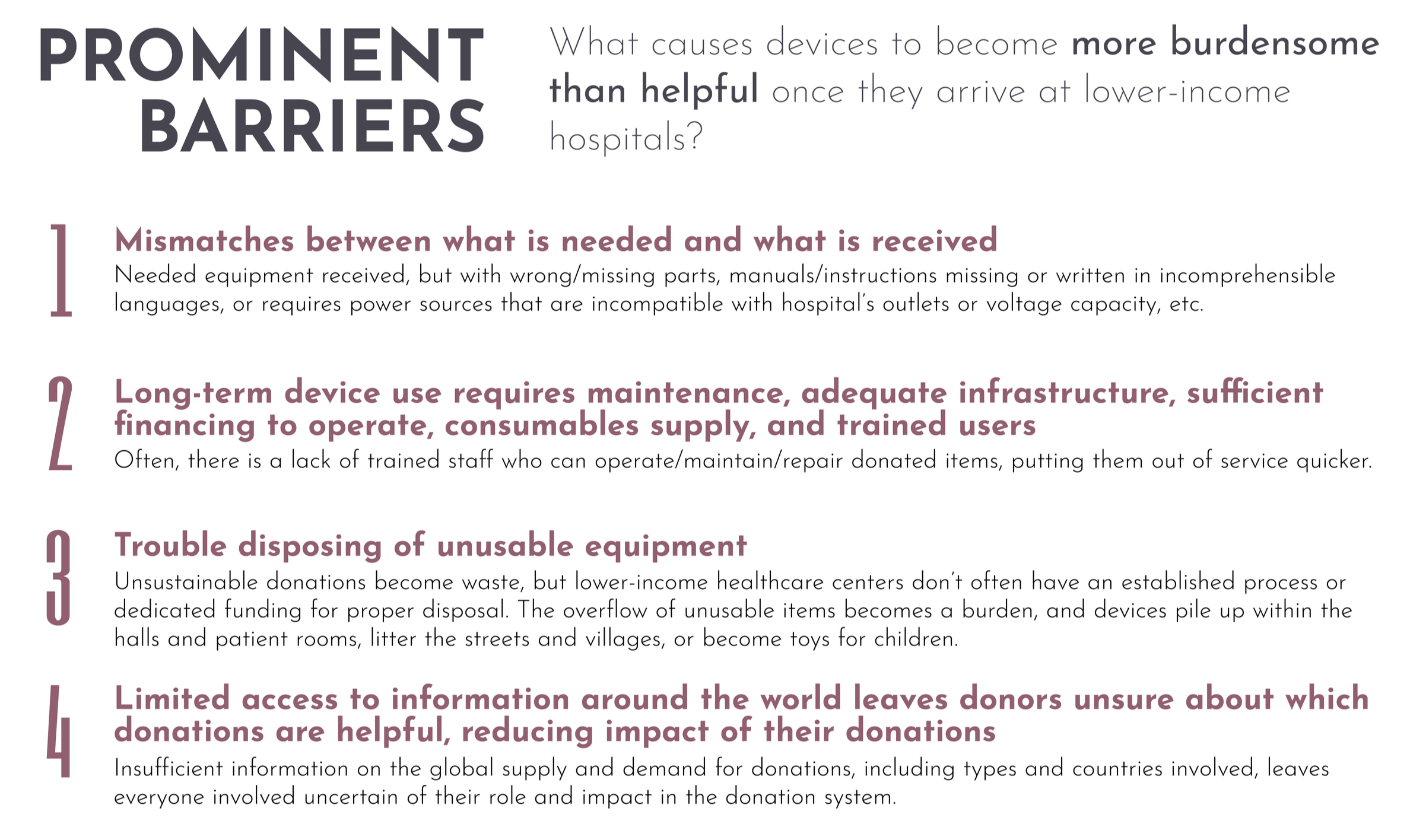 As highlighted in my research, an alarming level of medical waste is caused by many factors that prevent successful donation efforts to low-income healthcare centers. It is to the point where even a solution for any major aspect of the donation process would be largely ineffective due to the overwhelming number of additional barriers working against the system.
