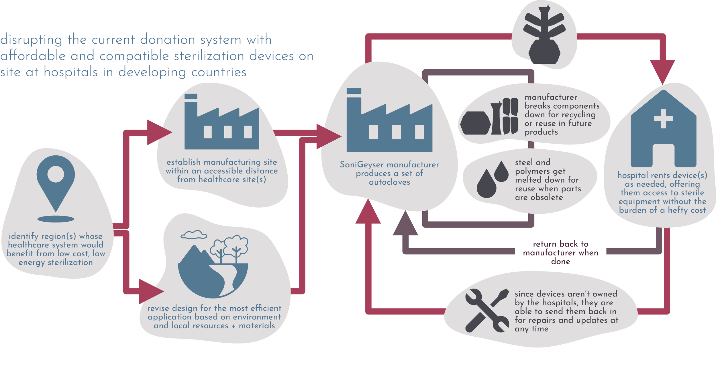 For this reason, my design proposes a business model that disrupts this problematic flow of donations and evades the current system entirely. This new system is exemplified through my blueprint concept of an autoclave sterilizer, the SaniGeyser, intended to be altered as fit for maximum efficiency at varying regions based on their climate and available resources.